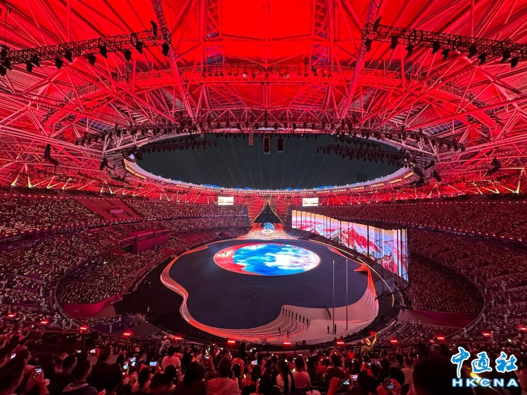 9月23日晚,杭州第19屆亞洲運動會開幕式在杭州奧體中心主體育場舉行,晚間20時許,開幕式正式拉開帷幕。作為本次大賽的開篇,杭州亞運會開幕式以“潮起亞細亞”為主題,寓意著新時代的中國正與亞洲、世界交融激蕩,像浪潮一樣奔湧向前。圖為開幕式現場。(香港中通社記者 付鈺攝)