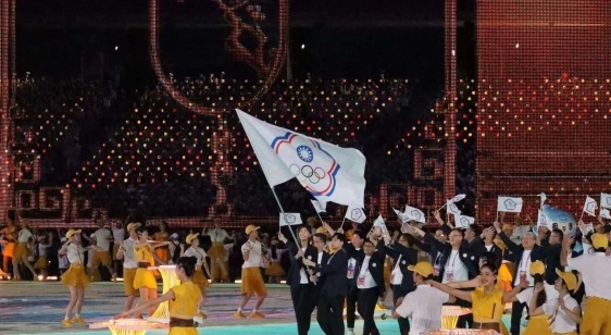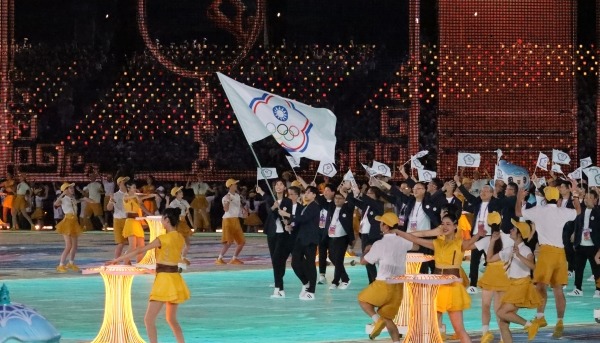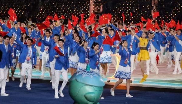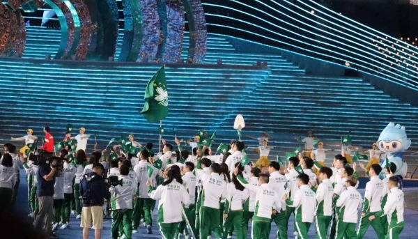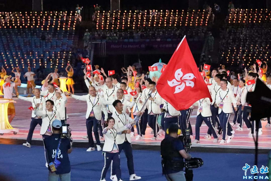 9月23日晚,杭州第19屆亞洲運動會開幕式在杭州奧體中心主體育場舉行,晚間20時許,開幕式正式拉開帷幕。圖為中國香港代表隊入場,旗手由男子橄欖球運動員姚錦成和武術運動員莫宛螢擔任。(香港中通社記者 洪少葵攝)