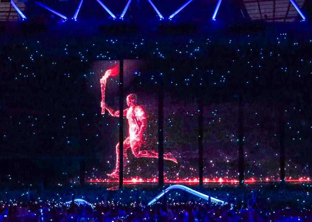 9月23日晚,杭州第19屆亞洲運動會開幕式在杭州奧體中心主體育場舉行,晚間20時許,開幕式正式拉開帷幕。圖為超過1億觀眾匯聚而成的“數字火炬手”來到現場共同完成火炬點燃。(香港中通社記者 洪少葵攝)