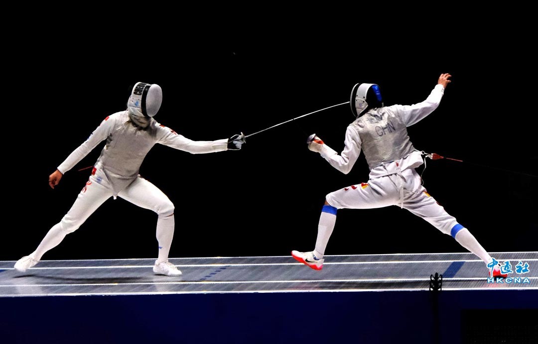 9月24日晚,杭州亞運會男子個人花劍決賽在杭州電子科技大學體育館舉行。中國香港隊選手張家朗(左)奪冠,中國隊選手陳海威獲得亞軍。(香港中通社記者 付鈺攝)