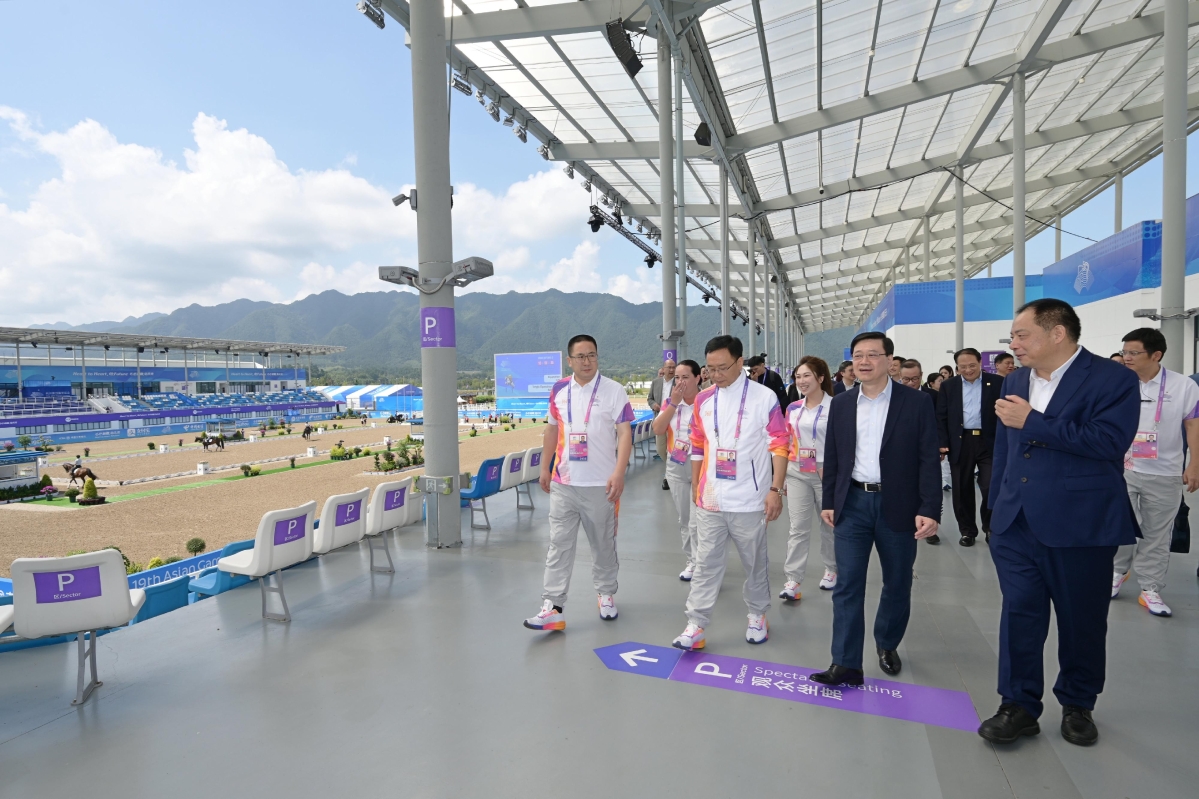 香港新聞網9月25日電 香港特區行政長官李家超今日(9月25日)率領香港特別行政區政府代表團到訪杭州第19屆亞洲運動會(亞運會)馬術場館桐廬馬術中心。 李家超一行抵達馬術場館後,參觀場館的設施,了解其建設和賽事的籌備工作。他們亦觀看了運動員訓練的情況,並和亞運會馬術項目的香港志願者交流。 李家超表示,很高興香港能為杭州亞運會作出貢獻。在杭州亞運會組委會和杭州市政府聯合邀請、特區政府駐浙江聯絡處協調聯繫下,香港賽馬會為杭州亞運會的馬術項目提供技術支持,發揮香港所長,服務國家所需。