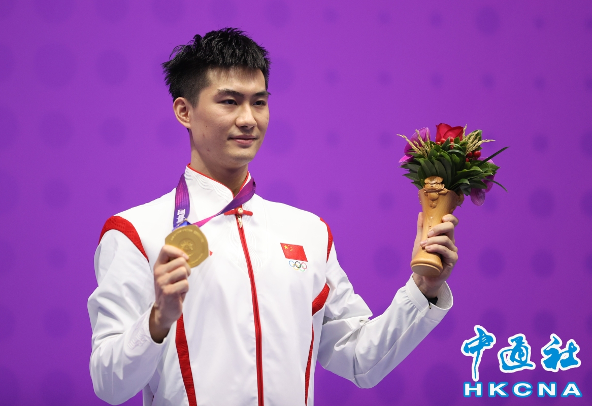 中國國家隊選手高浩楠在男子太極拳太極劍全能賽中摘得金牌。(香港中通社記者 洪少葵 攝) 從今天9點至22點,中國代表團拿下19枚金牌。 射擊項目中,中國隊的盛李豪在男子10米氣步槍個人賽中不僅贏得了金牌,更以253.3環的成績打破了世界紀錄。此後,由李越宏、劉楊攀和王鑫傑組成的射擊男子25米手槍速射團體更是以1765環打破世界紀錄,成績驚人。 賽艇項目也是中國隊的一大看點。中國隊當天奪得5枚金牌。其中,賽艇女子八人單槳有舵手的奪冠更是具有歷史意義,這是中國代表團在亞運會上獲得的第1500枚金牌。 韓國代表團繼續穩守第二名的位置。中華台北、印度和印度尼西亞也分別拿到了本屆亞運會的首枚金牌。(完) 【編輯:纪东】