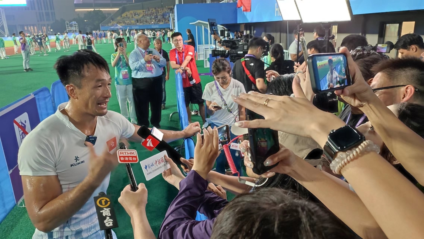 姚錦成賽後接受訪問時忍不住落淚。香港中通社圖片 其中“四朝元老”、累積贏得2金2銀的姚錦成,賽後接受訪問時忍不住落淚,指這條奪冠之路不容易,自己一直堅持下去是因為兩個字——“華人”。他希望能夠多些華人能夠參與欖球,立足世界舞台,不論是在亞運還是奧運。他又說,透過今次奪金,讓世界的華人知道“我們是可以的,我們可以站到最高舞台“。 對於自己最後一屆參與亞運能夠衛冕冠軍,姚錦成認為自己已經圓夢了,亦證明了自己一直的堅持是成功的,也希望自己的堅持、自己的動力可以影響下一代,有更多人參與欖球。