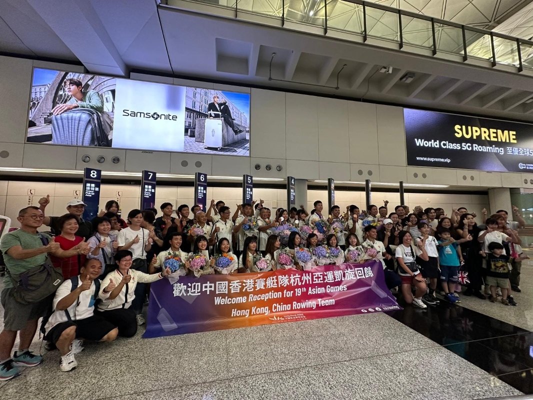 香港新聞網9月27日電 杭州亞運賽艇項目已經圓滿結束,中國香港賽艇代表隊以1金1銀1銅的佳績收官,除了突破上屆紀錄外,更是相隔9年再奪金牌。代表隊昨晚(26日)凱旋回港,中國香港賽艇協會主席吳江泓及總教練吳紀寧亦有到場送上祝賀。