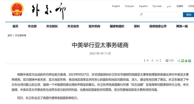 香港中通社9月29日電 據中國外交部29日消息,根據中美雙方達成的共識並應美方邀請,中國外交部副部長孫衛東27日在華盛頓同美國亞太事務助理國務卿康達舉行中美亞太事務磋商。