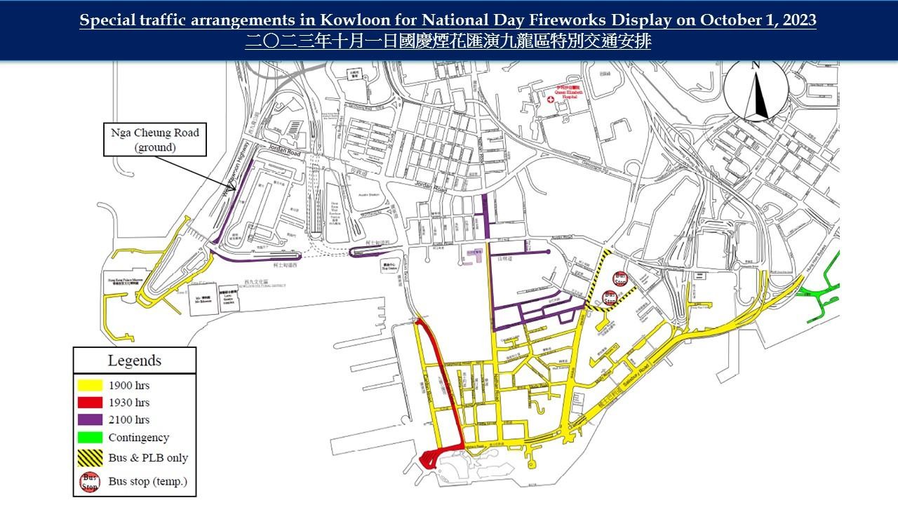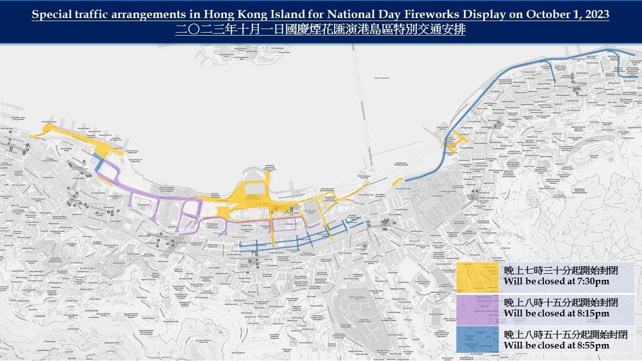 至於西九文化區,博物館道及文化道將在晚上7時半封路。而中區及灣仔區,民光街、民輝街、龍景街、分域碼頭街東行線、 博覽道等地在晚上7時半起陸續封閉。