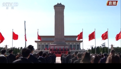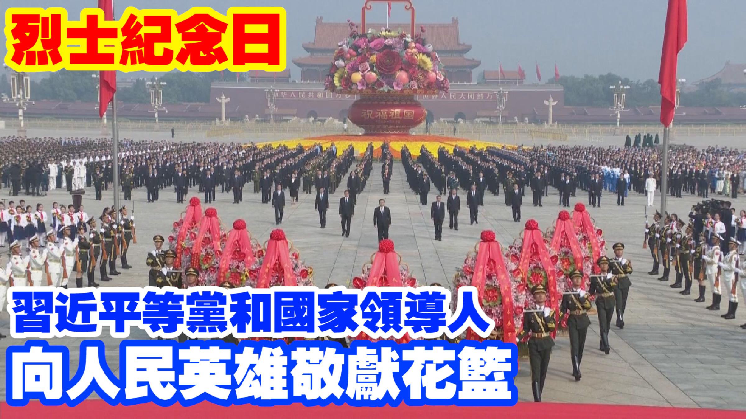 香港中通社圖片 在儀式開始時,全場齊聲高唱國歌,並肅立向英勇獻身的烈士默哀。習近平等黨和國家領導人緩步登上紀念碑基座,在花籃前駐足凝視,隨後緩步繞行,並瞻仰人民英雄紀念碑。 方陣前,以中共中央,全國人大常委會,國務院,全國政協,中央軍委,各民主黨派、全國工商聯和無黨派愛國人士,各人民團體和各界群眾,老戰士、老同志和烈士親屬,中國少年先鋒隊名義敬獻的9個大型花籃一字排開,花籃紅色緞帶上書寫上“人民英雄永垂不朽”。
