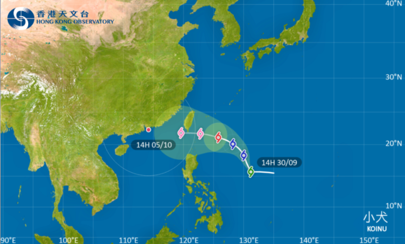 香港中通社9月30日電 9月30日,熱帶氣旋“小犬”在西北太平洋生成,現集結在菲律賓馬尼拉以東約1160公里。據香港天文台熱帶氣旋路徑圖顯示,“小犬”下周初至中期移向呂宋至台灣一帶,並於下周四(10月5日)增強為強颱風,闖入香港800公里範圍,惟受東北季候風影響,“小犬”隨後的路徑及強度存在變數。
