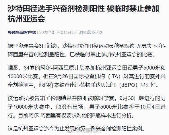 央視新聞報道截圖 據悉,34歲的阿爾-阿西里原計劃參加杭州亞運會田徑男子5000米和10000米比賽。但在9月26日國際檢查機構(ITA)對其進行的賽外興奮劑檢測中,他的樣本被查出違禁物質達貝泊汀(dEPO)呈陽性。 該運動員被告知了檢測結果并隨即被臨時禁賽。9月30日晚進行的男子10000米決賽中,他沒有出場。男子5000米比賽將於10月4日進行。目前阿爾-阿西里有權要求對他的B瓶樣本進行分析。 這是杭州亞運會迄今為止發現的第一例興奮劑檢測陽性案例。(完) 【編輯:王軼南】