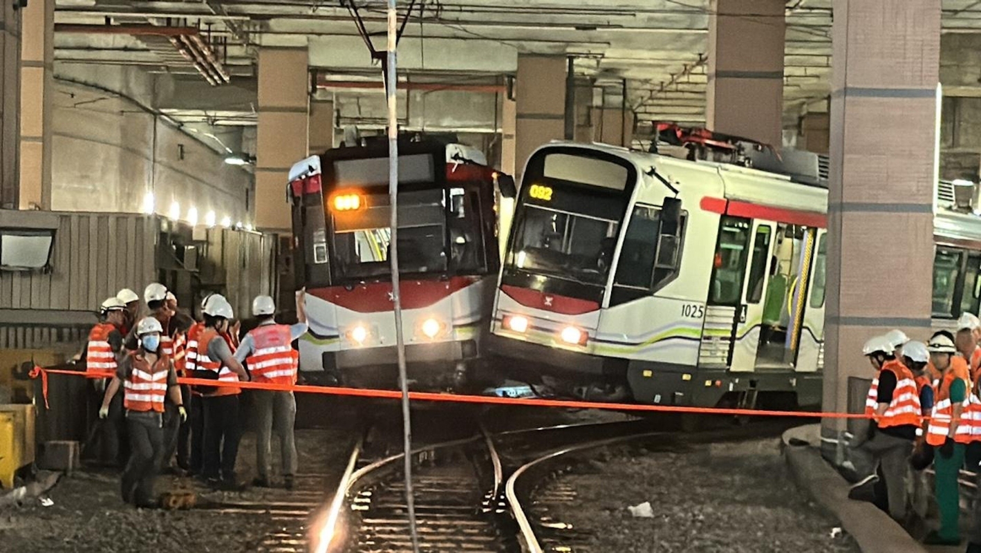 两列轻铁列车相撞(马耀文摄) 現場所見,兩列車車頭相撞,其中一車更告出軌;大批工程人員在場處理。 港鐵稱,由於輕鐵元朗站發生交通事故,目前由元朗站至塘坊村路段需要暫停,輕鐵610、614、615及761P需要改道,不經上述路段。港鐵已安排免費接駁巴士行走洪天路緊急月台至元朗站路段,接載受影響車站的乘客。