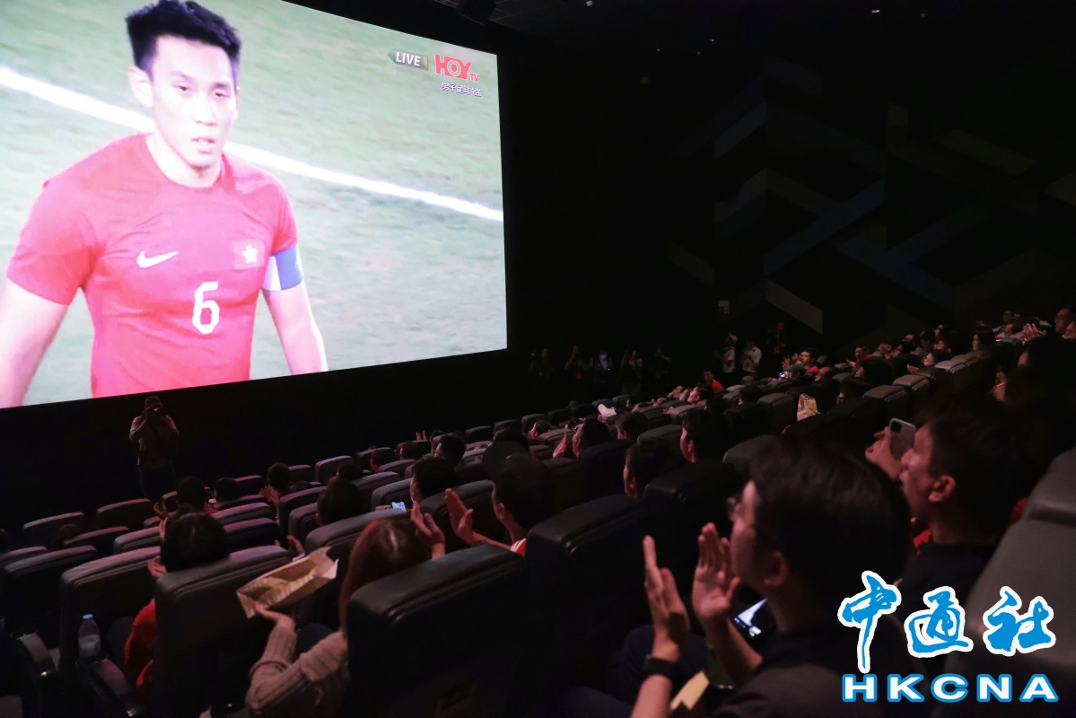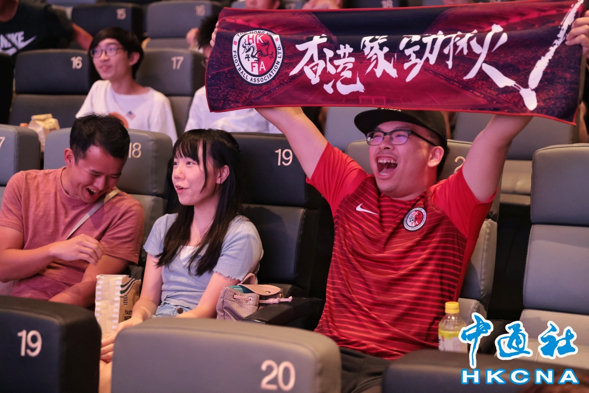 香港中通社 記者 謝光磊攝 另外,香港足球總會今晚在銅鑼灣時代廣場英皇戲院,舉行球迷“一元睇波”活動。球迷只需付款1元港幣,即可在戲院以大螢幕觀看比賽,更可獲爆谷1份,以及飲品半價。門票開賣不足3分鐘便迅速售罄。開場前一小時,已經有大批市民在戲院外等候,部分人身穿港隊球衣,有人甚至身披區旗到場 而多名司局長亦有前往亞運直播區觀看,包括財政司司長陳茂波、財政司副司長黃偉綸、文化體育及旅遊局局長楊潤雄、房屋局局長何永賢及康文署署長劉明光等。他們手持區旗及加油棒,落力為港隊打氣。(完) 【編輯:孟宜君】