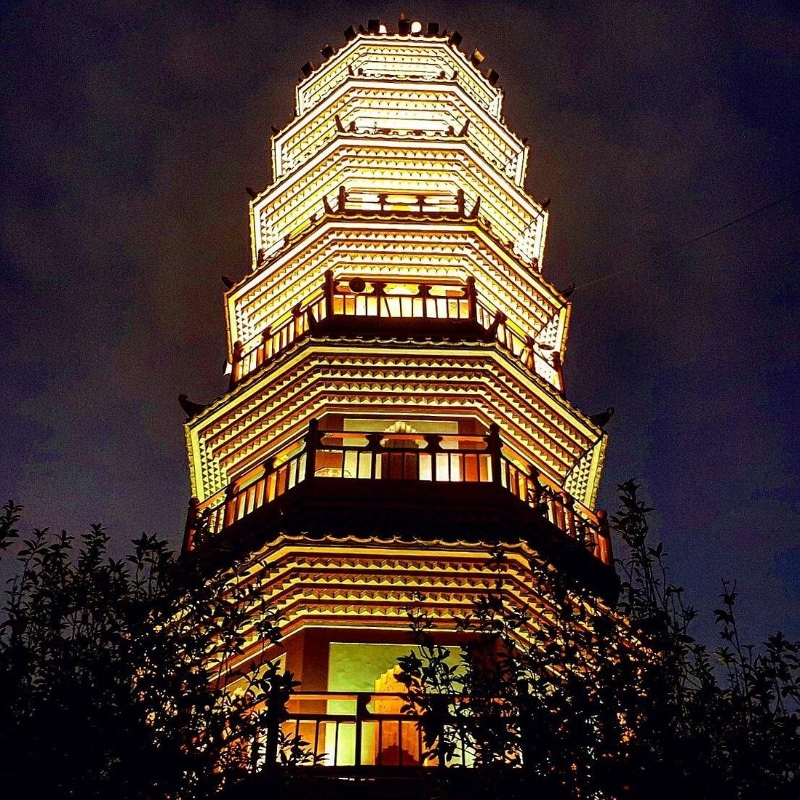 阜峰文塔夜景。 阜峰文塔(中山市石岐區孫文西路) 阜峰文塔又名煙墩花塔,建於明代萬曆三十六年(1608年),是一座七層八角的樓閣式磚砌花塔。塔高24.5米,原為空心塔,1952年重修時,把上三層改為實心,內有石級可直登塔頂。在頂層倚欄眺望,中山城區風光盡收眼底。此塔一向被視為中山的象征,不少商品以此為商標圖案。