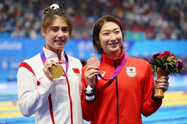 34歲的載譽老將,其實可以功成身退了,但鞏立姣依然選擇不斷突破自己。“即使有一百個理由去放棄,但只要有一個理由存在,我就可以堅持,那就是我的終極夢想——21米。” 08 奪得女子50米蝶泳冠軍後,張雨霏非常罕見地哭了,不是為自己,而是為對手——獲得銅牌的日本選手池江璃花子。 池江璃花子曾在2018年雅加達亞運會狂攬6枚金牌,被譽為日本游泳的“明日之星”。但次年,她不幸罹患白血病,夢想之路戛然而止。 “我想給大家勇氣,尤其是那些和我一樣患病的人。”經歷與病痛的生死搏鬥後,她像個戰士一樣重新回到最愛的泳池。 東京奧運會上,張雨霏曾與池江璃花子約定“亞運會見”。今年,她們終於一起站上領獎台。張雨霏含淚說:“只要她出現在泳池里,就是一個奇跡。”