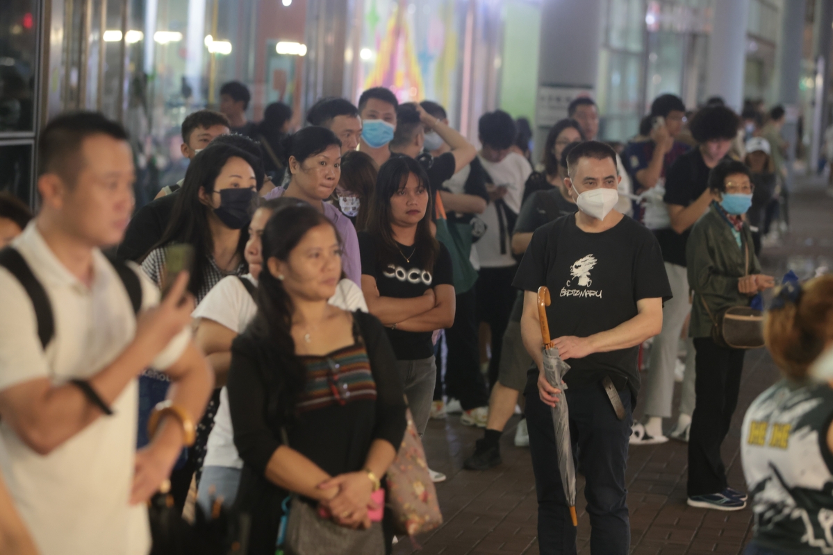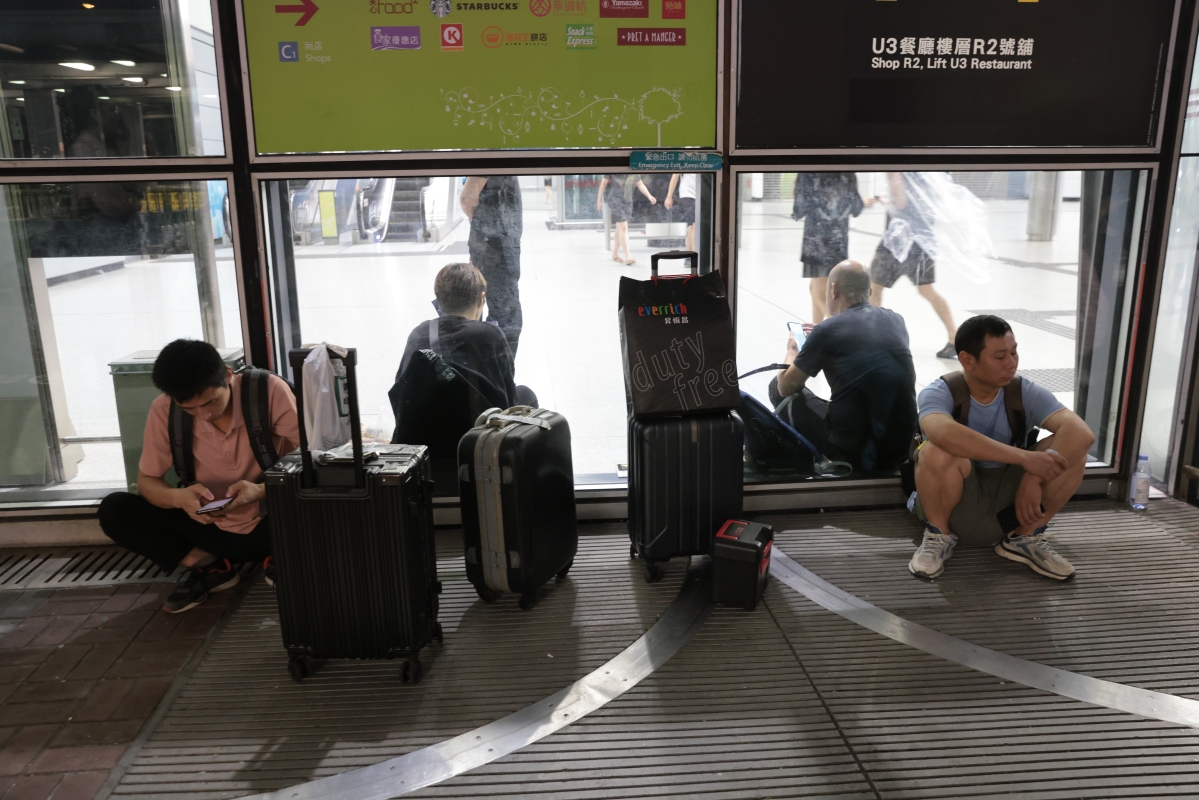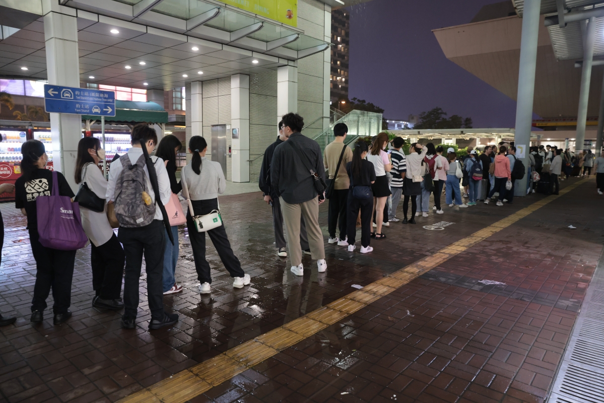 圖為當8日晚21時30分,紅磡站內外均擠滿人潮,的士站大排長龍,只有零星的士到場接載,不少乘客滯留時間超過2小時。(香港中通社記者 謝光磊攝)