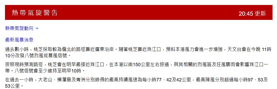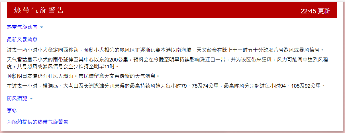 圖源:天文台 天文台指,過去一兩小時小犬穩定向西移動,預料小犬相關的飓風區正逐漸遠離本港以南海域,天文台會在晚上十一時五十分改發八號烈風或暴風信號。 天氣雷達顯示小犬的雨帶延伸至其中心以東約200公里,預料會在今晚至明早持續影響珠江口一帶,并為該區帶來狂風,風力可能間中達烈風程度,八號烈風或暴風信號會至少維持至明早11時。 預料明日本港仍有狂風大驟雨。市民請留意天文台最新的天氣消息。 在過去一小時,橫瀾島、大老山及長洲泳灘分別錄得的最高持續風速為每小時79、75及74公里,最高陣風分別超過每小時94、105及92公里。 (完) 【編輯:錢林霞】