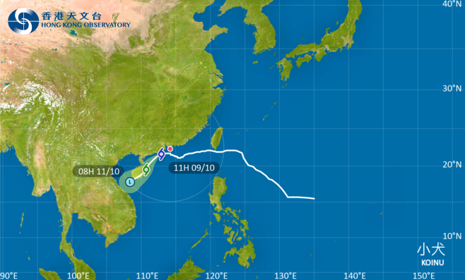 天文台表示,隨著“小犬”繼續遠離香港,香港風力逐步減弱,天文台在下午2時40分改發一號戒備信號取代三號強風信號。“小犬”相關的雨帶仍會為本港帶來狂風驟雨及雷暴,雨勢有時頗大。市民請保持警惕。 另外,香港天文台在下午時20分發出黃色暴雨警告信號的特別報告,指香港廣泛地區已錄得或預料會有每小時雨量超過30毫米的大雨,且雨勢可能持續。 天文台表示,“小犬”會在今明兩日橫過廣東西部沿岸並逐漸減弱,但其相關的外圍雨帶仍會繼續影響該區。受乾燥的東北季候風影響,本周中後期華南天色漸轉晴朗,日夜溫差較大。此外,預料一個廣闊低壓區會在週末期間至下週初為南海中部帶來不穩定天氣。同時,一股東北季候風補充會抵達華南沿岸,該區風勢較大。