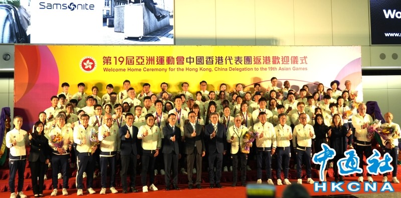 香港新聞網10月9日電 (記者 張明臻)香港特區政府9日在香港國際機場舉行歡迎儀式,迎接杭州第19屆亞洲運動會中國香港代表團成員凱旋。不少市民在現場豎起拇指迎接。