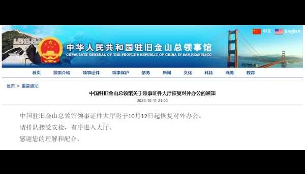 香港新聞網10月10日電 據中國駐舊金山總領館網站消息,中國駐舊金山總領館發言人表示,當地時間2023年10月9日下午,有不明身份人員駕車暴力衝撞闖入中國駐舊金山總領館證件大廳,對工作人員及現場民眾生命安全構成嚴重威脅,對中國駐舊金山總領館設施與財產造成嚴重破壞,性質極其惡劣。 發言人稱,目前犯罪嫌疑人已被警方控制。中國駐舊金山總領館嚴厲譴責這起暴力襲擊事件,保留追究事件相關責任的權利。中國駐舊金山總領館已向美方提出嚴正交涉,要求迅速查明真相,依法嚴肅處置,並敦促美方按照《維也納外交關係公約》《維也納領事關係公約》和《中美領事條約》規定,採取一切必要措施確保總領館人員及館舍安全。