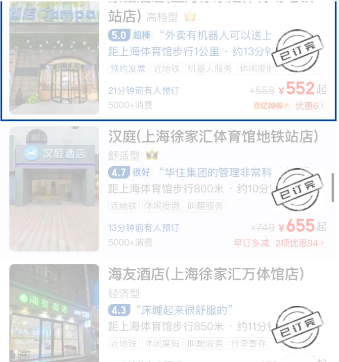 演唱會場館周邊酒店均已滿房。圖源:美團APP 距上海體育場1.4km的全季酒店,平日價格為380-500元之間,演唱會期間價格為687-1049元。距上海體育場700m的桔子酒店,平日價格為390-620之間,演唱會期間價格為1409-2186元。