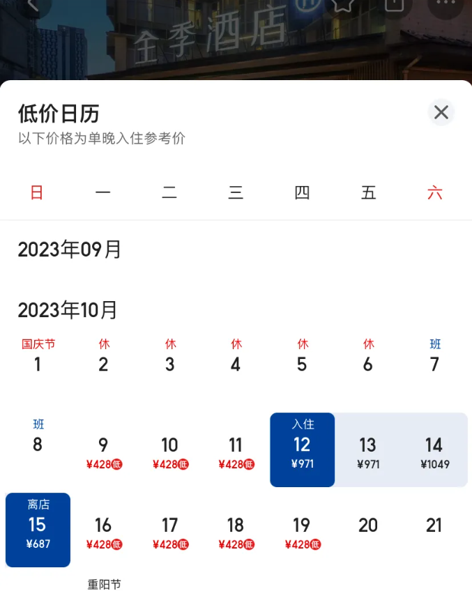 周傑倫歌迷會官方微博截圖。 以美團APP酒店低價日曆上所顯示的價格為例,距上海體育場800m的漢庭(上海徐家匯體育館地鐵站店),平日價格為300元以下,演唱會期間價格為572-784元,且10月14日已經滿房。