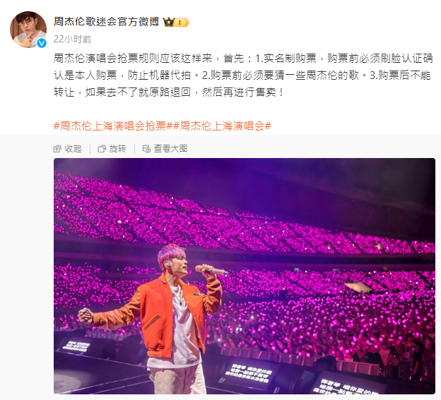 周杰倫今起上海開唱 11萬門票秒沒場館周邊酒店房價翻倍香港新聞網10月12日電 周杰倫2023“嘉年華”世界巡迴演唱會上海站今起開唱,12日至15日連唱四天。演出門票開賣一分鐘內,11萬張門票就被“秒沒”,火爆程度可見一斑。記者搜索旅遊預訂平台發現,周杰倫演唱會所在場館上海體育場的周邊酒店均已滿房,且價格達到近期峰值,呈翻倍式增長。