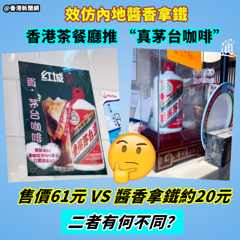(香港新聞網製圖) 據社交平台小紅書上網友的爆料,位於灣仔的“紅城冰室”近日推出“真茅台咖啡”飲品,一杯要價61元(港幣,下同),約是內地醬香拿鐵的3倍。 用料方面,二者有些微差異。內地醬香拿鐵采用的是白酒風味厚奶,當中白酒排在配料表的第10位;而港版“真茅台咖啡”的用料似乎簡單粗暴多了,根據其餐牌推測,商家應是直接往咖啡裡兌茅台。 雖然兩款飲品稱不上是“雙胞胎”,可香港商家確實是受內地飲食潮流影響,借鑒了內地的創意。 翻查資料,位於灣仔的夜間市集“海濱藝游坊”,也有主賣豆製品的攤主獲內地醬香拿鐵啟發,於豆漿內加入茅台酒,製成“醬香豆漿”,售價20元一支,吸引不少市民購買。 同時,“反向代購”清單的第一名、港人北上必買的美食——內地網紅店鮑師傅的糕點在香港亦出現“追隨者”、“模仿者”。日前,有網友在小紅書分享,位於尖沙咀、主打曲奇的“香港小熊”店鋪就推出“類似”鮑師傅王牌產品肉鬆小貝的糕點。