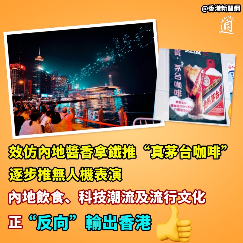 (小紅書截圖) 更別提早已打入香港市場的內地奶茶品牌喜茶、奈雪的茶了,至今人氣不減,店外常大排長龍。 對比以前,港式餐飲滿記甜品、表哥茶餐廳、翠華茶餐廳等紛紛北上,擴充飲食版圖,現時內地餐飲無疑對港式飲食文化進行了一波反向輸出。 值得關注的是,這波輸出還不單局限在飲食方面。近年,內地科技發展一日千里,無人機表演的視頻常常於香港網絡引發贊嘆。在香江應加強創科發展、不能抱殘守缺的呼喊聲中,東方之珠亦效仿內地,逐步推行無人機表演。 2018年6月,香港的首次無人機表演於沙田城門河上公演,100架無人機隨音樂“翩翩起舞”;2020年除夕夜,1000架無人機“點亮”維港上空。 今年的中秋及國慶節,香港再接再厲,出動逾1000架無人機,在中環海濱外進行大型無人機表演,令市民及遊客大感震撼。