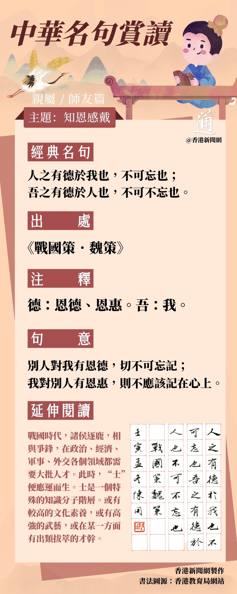 香港新聞網10月18日電 當別人對自己有恩惠,我們會以“飲水思源”來報答,意思是要緊記別人對自己的恩德;而當我們幫助了別人的時候,就要不求回報。 在古代,意思與之相同的名句就有:“人之有德於我也,不可忘也;吾之有德於人也,不可不忘也”,出自《戰國策 · 魏策》。 為加強中國文學和文言經典的學習,香港特區政府教育局繼續開展“中華經典名句推廣活動”,從《致知達德》(中華傳統美德語文學習資源)中選取40則名句,作為本學年推廣的內容。香港新聞網“中華名句賞讀”系列今日解讀“人之有德於我也,不可忘也;吾之有德於人也,不可不忘也”。