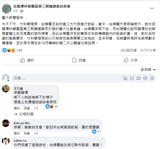 反龍潭科學園區第三期擴建案自救會在政府門前抗議 據台媒此前報道顯示,主要為台積電2nm以下制程晶圓廠用地的竹科管理局規劃龍潭科學園區擴建第三期計劃,預計征收158.59公頃土地,提供約5,900個就業機會。而此擴建計劃中涉有88%為私人土地,引發當地居民組織自救會,并從10月初開始前往竹科管理局抗議,要求撤回擴建案。 “反龍潭科學園區第三期擴建案自救會”發文指出,竹科管理局、台積電及自救會三方代表進行會談,會中台積電代表明確表示,對因龍潭科學園區第三期擴建案而引發的龐大社會爭議,台積電深感不安,并認同龍潭在地鄉親愛護土地及家園的強烈情懷,決定放棄原本在擴建案內的設廠計劃。