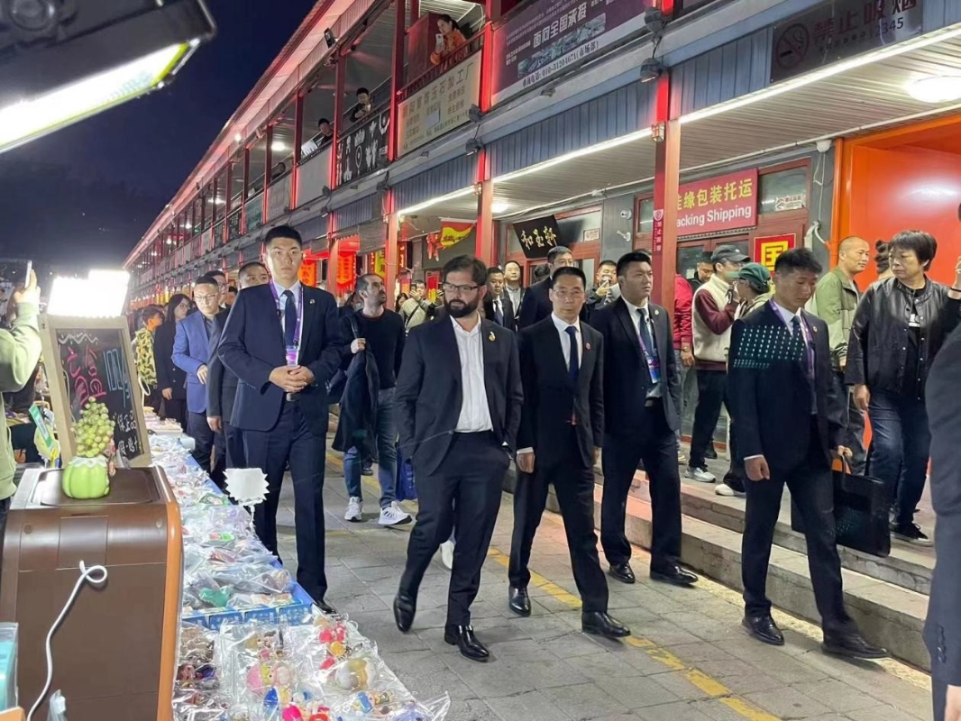 18日,智利總統博里奇逛潘家園舊貨市場。 圖源:北京日報 出生於1986年的博里奇,在35歲時當選智利總統。作為智利史上最年輕、獲得選票最多的總統,博里奇以年輕有為、率性樸實的形象,成功拉近了他與中國民眾的距離。