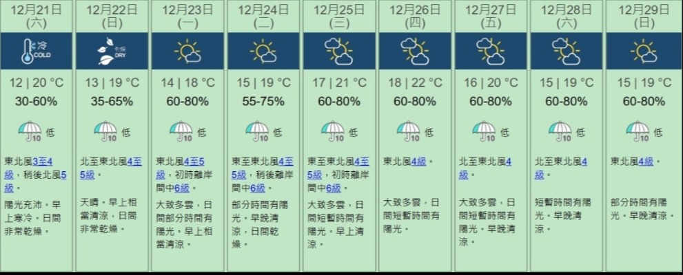 香港新聞網10月20日電 一道冷鋒正橫過廣東沿岸地區。香港天文台表示,受冷鋒隨後的東北季候風影響,週末期間廣東沿岸風勢較大,早晚稍涼。根據天文台網站顯示,香港周末天氣介乎21至25度,其中周日清晨新界多處最低溫約18度。