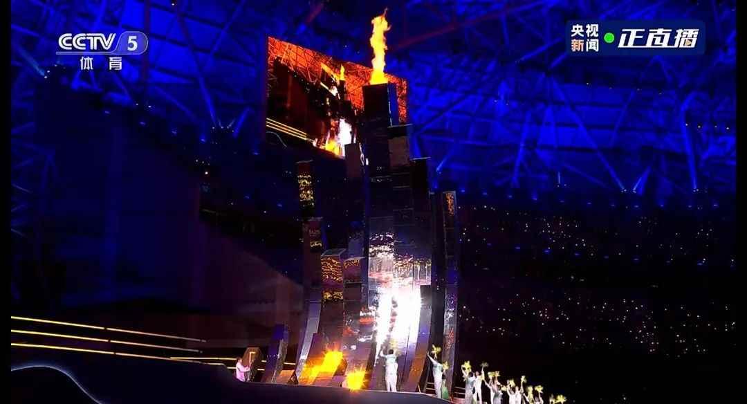 5、在全場鼓聲、喝彩聲的陪伴下,最後一棒火炬手行至火炬塔下,殘健兒童手持桂花,攜手匯聚於“潮湧”之下,共盼聖火點燃。