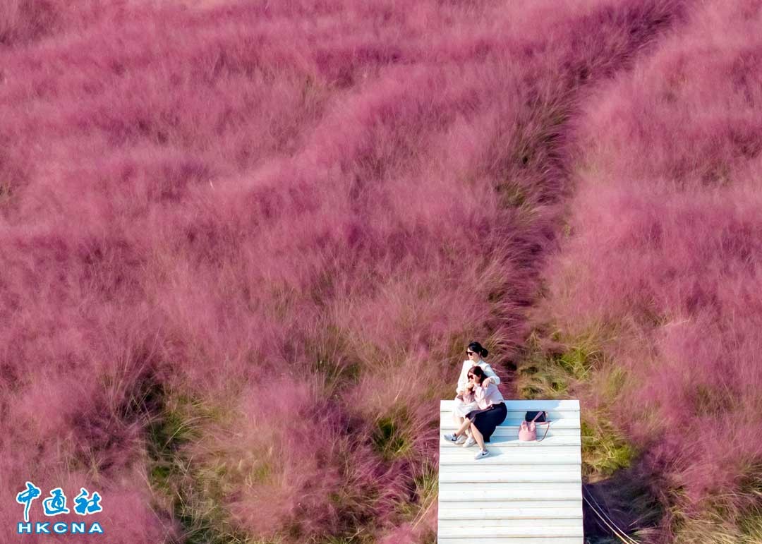 10月17日,航拍南京東郊湯山礦坑公園種植的粉黛亂子草,如煙似霧呈現粉色浪漫。 香港中通社圖片