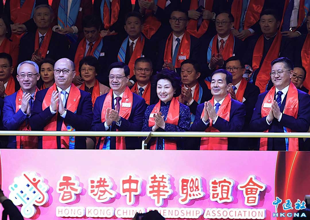 10月19日,香港中華聯誼會在會展中心舉行成立儀式暨第一屆理事會就職典禮。香港特區行政長官李家超(左3)、香港中聯辦主任鄭雁雄(左2)、中華海外聯誼會副會長陳小江(右2)等出席。(香港中通社記者 曹文毓攝)