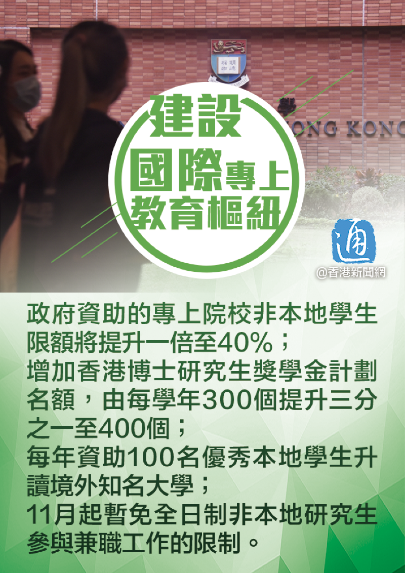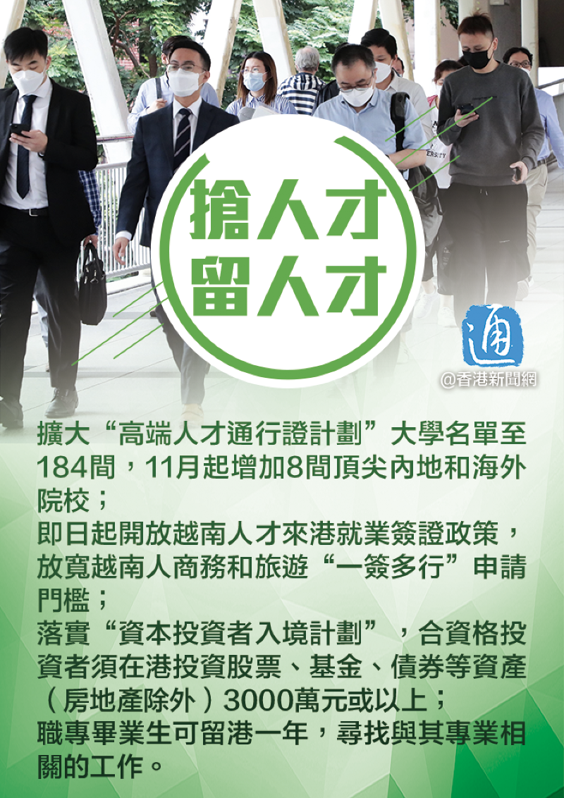 香港新聞網製圖。 搶人才、留人才 【11:41】落實“資本投資者入境計劃” , 在香港投資於股票、基金、債券等資產(房地產除外)3000萬元或以上的合資格投資者,可以透過計劃申請來港,以增強香港資產及財富管理、金融及相關專業服務界別的發展優勢,細節今年內公布。職訓局2024/25學年起入學的指定全日制高級文憑課程外地學生,畢業後可留港一年,尋找與其專業相關的工作。 【11:40】“人才服務辦公室” 將在本月底正式成立。明年亦會舉辦“全球人才高峰會暨粵港澳大灣區人才高質量發展大會”,推動區域招攬人才交流和合作。 擴大“高才通”大學名單 開放越南人才就業簽證 【11:39】擴大“高端人才通行證計劃”大學名單 ,擴闊吸納世界各地人才網絡。11月起,合資格大學名單會增加八間頂尖內地和海外院校至184間;即日起開放越南人才來港就業的簽證政策,並放寬越南人商務和旅遊“一簽多行”來港的申請門檻。亦會開放老撾及尼泊爾人才來港就業、受訓和就讀大學教育資助委員會資助院校。 【11:38】會發展“總部經濟”,吸引海內外公司到港設立總部╱分部業務,為香港引進優質企業。特區政府會與中央相關部委探討便利內地企業在港設立總部╱分部的措施,例如資本項目投資的便利安排。