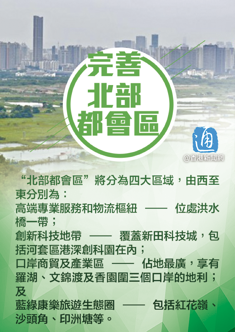 香港新聞網製圖。 推進“北部都會區”發展新引擎 【11:56】短期內公布《北部都會區行動綱領》,深度對接深圳和大灣區其他城市的規劃。“北部都會區”將分為四大區域,由西至東分別為:高端專業服務和物流樞紐;創新科技地帶;口岸商貿及產業區;以及藍綠康樂旅遊生態圈。 在洪水橋及新界北新市鎮等地預留用地作專上院校發展,打造“北都大學教育城”;在古洞北、洪水橋等預留政府辦公大樓用地;在新田科技城及新界北等地興建標誌性的文化藝術設施。另外會在“北部都會區”預留土地供國際學校發展;亦會落實興建三寶樹濕地保育公園。