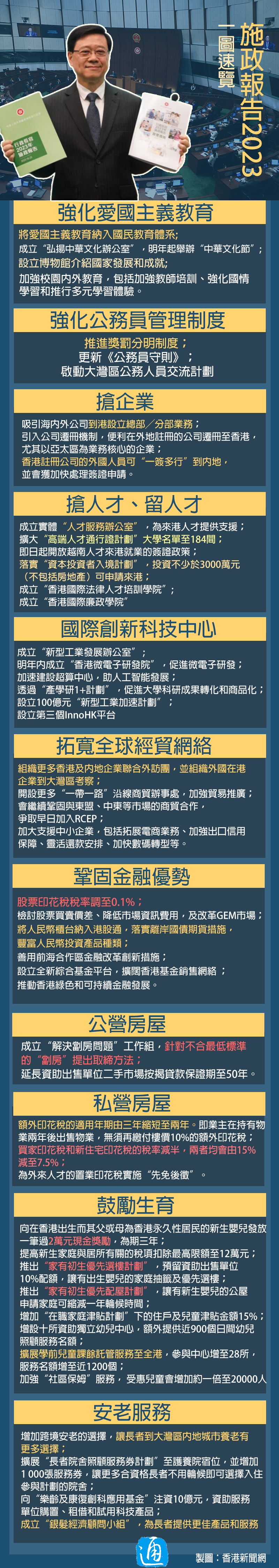 香港新聞網10月25日電 行政長官李家超今日(25日)發表任內第二份施政報告。在新一份施政報告中,李家超提到將進一步強化愛國教育、公務員管理制度,以及搶人才、搶企業等發展措施;亦提出樓市減辣、鼓勵生育、成立“解決劏房問題”工作組等一系列惠民政策。新一份施政報告都有哪些要點?戳圖了解!