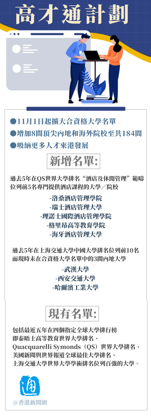 香港新聞網10月26日電 香港特區政府今日(26日)公布,由11月1日起擴大“高端人才通行證計劃”(高才通計劃)的合資格大學名單,增加8間頂尖內地和海外院校至共184間,吸納更多人才來港發展。戳圖了解有哪些新增的大學↓↓