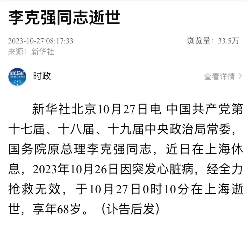 香港中通社10月27日電 據北京官媒報道,中國共產黨第十七屆、十八屆、十九屆中央政治局常委,國務院原總理李克強近日在上海休息,2023年10月26日因突發心臟病,經全力搶救無效,於10月27日0時10分在上海逝世,享年68歲。(完)