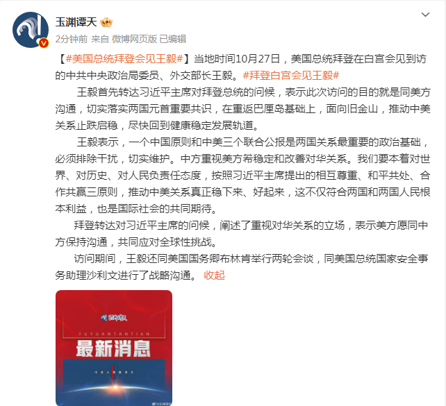 香港新聞網10月28日電 據央視新聞官方公眾號“@玉淵譚天”最新消息,當地時間10月27日,美國總統拜登在白宮會見到訪的中共中央政治局委員、外交部長王毅。