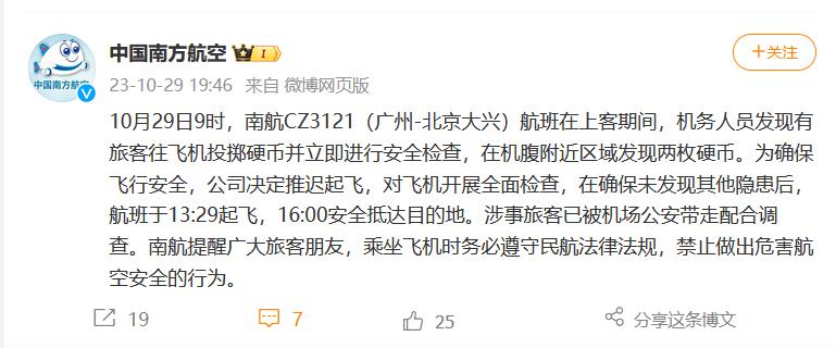 香港新聞網10月30日電 據@中國南方航空 微博消息,10月29日9時,南航CZ3121(廣州-北京大興)航班在上客期間,機務人員發現有旅客往飛機投擲硬幣並立即進行安全檢查,在機腹附近區域發現兩枚硬幣。為確保飛行安全,公司決定推遲起飛,對飛機開展全面檢查,在確保未發現其他隱患後,航班於13:29起飛,16:00安全抵達目的地。涉事旅客已被機場公安帶走配合調查。南航提醒廣大旅客朋友,乘坐飛機時務必遵守民航法律法規,禁止做出危害航空安全的行為。