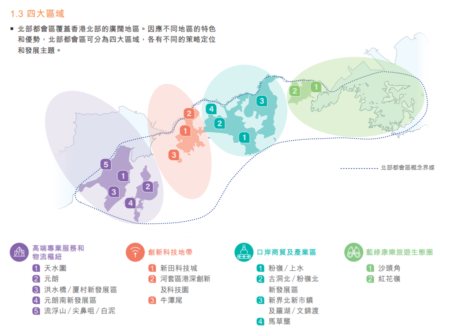 香港新聞網10月31日電(記者 陳卓儀)香港特區政府30日公佈了《北部都會區行動綱領》,勾勒了北部都會區四大未來發展區域,從西到東涵蓋專業服務、創科、商貿、旅遊四大定位。這不僅是香港北部的規劃,更是深港邊境未來10年的發展輪廓。 北部都會區發展概念由特區政府2021年提出,並公佈《北部都會區發展策略》,該區面積達3萬公頃,約佔香港總面積的三分之一,潛力不小。經過三年時間,發展方向逐漸清晰。從一開始的發展新市鎮,到現在以“產業帶動,基建先行”為主軸,雙城三圈也進化為四大區域:高端專業服務和物流樞紐、創新科技地帶、口岸商貿及產業區、藍綠康樂旅遊生態圈。