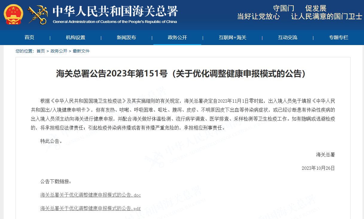 香港新聞網10月31日電 中國海關總署公布,11月1日零時起,出入境人員免於填報俗稱黑碼的“出入境健康申明卡”,但有發熱、咳嗽、呼吸困難、嘔吐、腹瀉、皮疹、不明原因皮下出血等傳染病症狀,或已診斷患有傳染性疾病的出入境人員須主動向海關進行健康申報,並配合海關做好體溫檢測、流行病學調查、醫學排查和採樣檢測等衛生檢疫工作。 海關總署表示,如有隱瞞或逃避檢疫,將承擔相應法律責任;引起檢疫傳染病傳播或者有傳播嚴重危險的,承擔相應刑事責任。