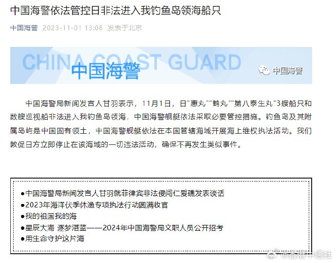 香港中通社11月1日電 中國海警局新聞發言人甘羽表示,11月1日,日本“惠丸”“鶴丸”“第八泰生丸”3艘船隻和數艘巡視船非法進入我釣魚島領海,中國海警艦艇依法採取必要管控措施。