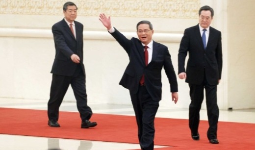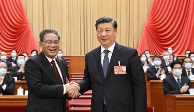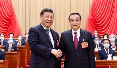 新華社記者 蘭紅光 攝 2013年3月15日,第十二屆全國人民代表大會第一次會議在北京人民大會堂舉行第五次全體會議。會議經過投票表決,決定李克強為中華人民共和國國務院總理。這是習近平同志和李克強同志親切握手。
