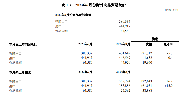 香港政府亦表示,香港經濟第三季持續擴張主要是由於內部需求及服務貿易均進一步改善。若按經季節性調整而作相連季度比較,香港第三季GDP按季實質上升0.1%。 正如數據顯示,拉動香港經濟的金融、消費、服務貿易、進出口這“四駕馬車”中,數據略有增長是因消費與服務貿易的拉動。以GDP主要組成部分分析,香港第三季私人消費開支按年上升6.5%;進出口方面,貨品出口總額按年跌8.6%;貨品進口按年下跌6.0%;服務輸出按年上升24.0%;服務輸入按年上升28.5%。同時,在資本市場方面,今年二季度香港IPO市場雖然從年初的相對相對疲弱到有所改善,但香港上半年募資總額仍只有178.5億港元,與去年同期相比減少9.5%。 香港的“四駕馬車”帶動的是其他行業的發展,創造就業,是香港經濟動力的所在。但從目前的數據來看,總體來說依然不太樂觀。 在中國內地有“金九銀十”的說法,金九銀十雖是一個時間上的概念,但已在經濟領域成為拉動經濟的表現。當人們進入秋天收穫的季節,在消費、投資上是一年來明顯增加的一個時間節點。這個時候人們的消費心理比較鬆動,構成相對較高的消費和投資欲望,所以這兩個月的經濟表現會明顯高於其他月份,“金九銀十”的現象也成了各行業每年一度銷售旺季的代名詞。這樣的旺季或也會推動年底的一波市場表現。 記者梳理數據發現,“金九”的形態已有顯現。香港2023年9月的零售業總銷貨數量的臨時估計較2022年同月上升10.1%,在香港進出口貿易上,整體出口和進口分別與8月份相比分別上升了6.2%和15.9%。