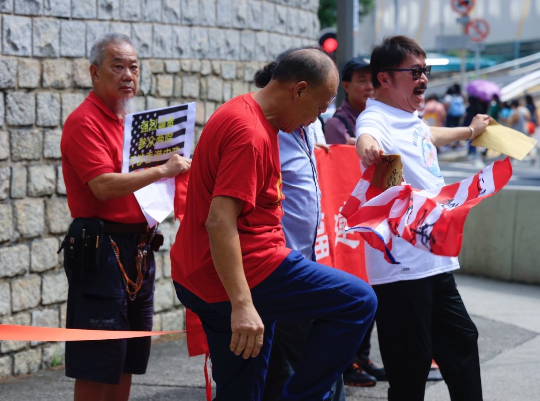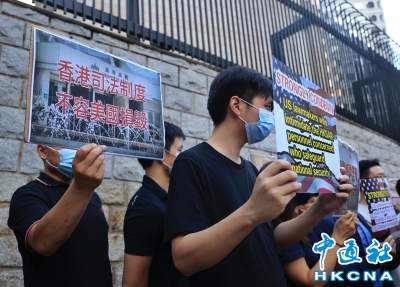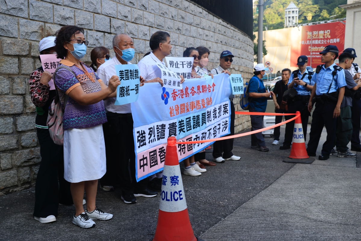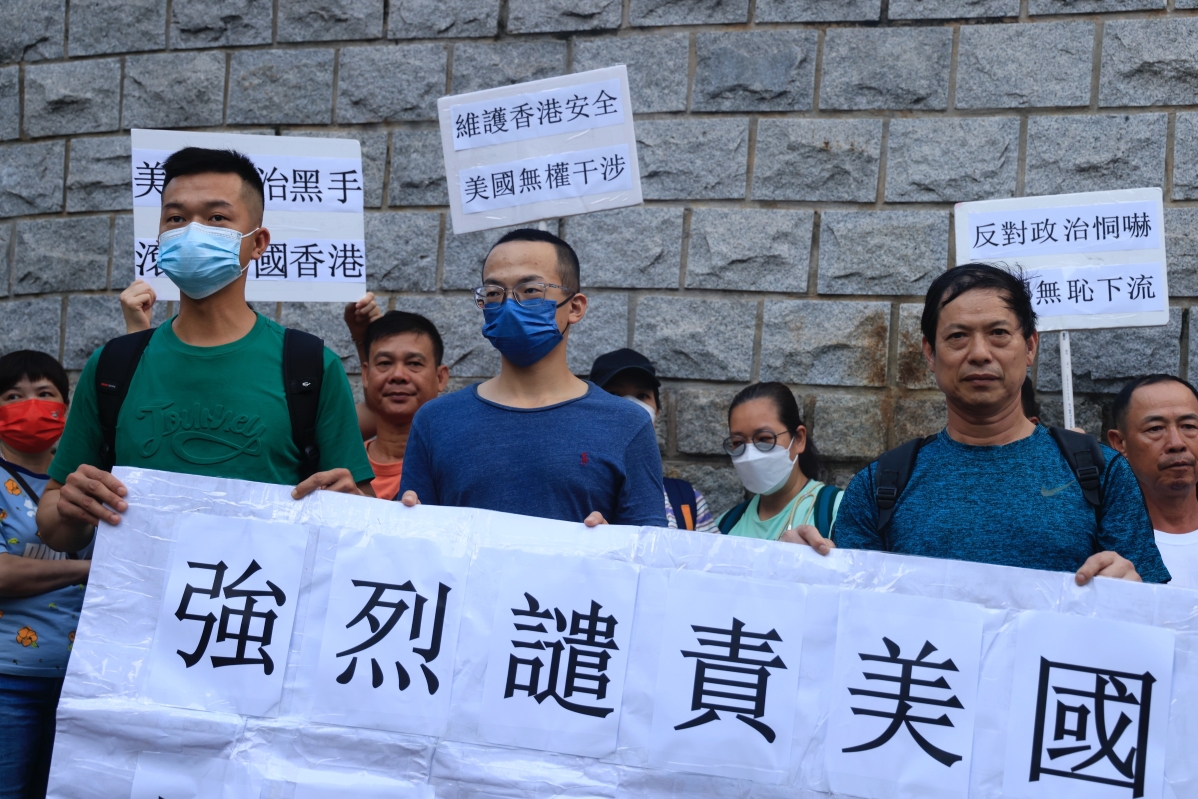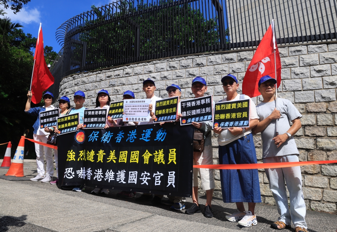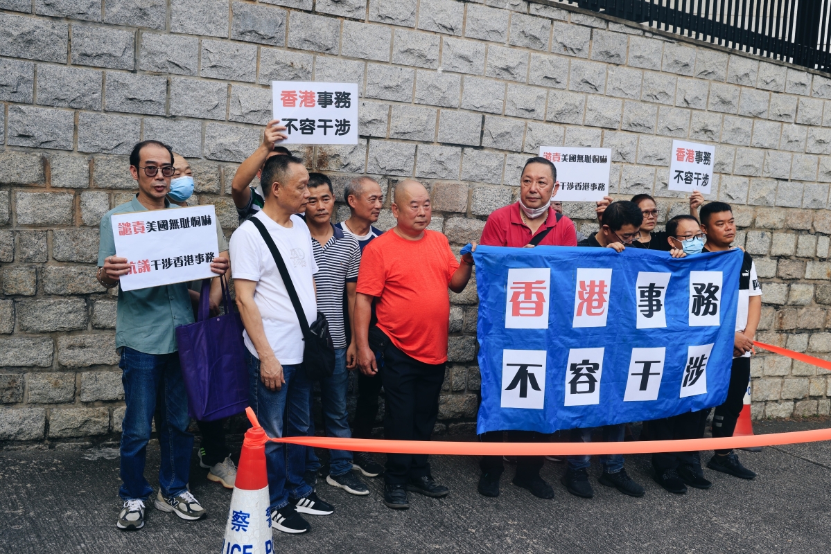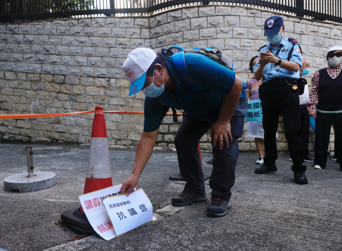 香港新聞網11月5日電 (記者曹文毓)11月5日,香港多個團體及市民自發到美國駐港總領事館前,強烈譴責美國國會跨黨派議員提出法案,恐嚇制裁49名香港特區官員,嚴重干預香港事務,嚴重違反國際關係法則。當天,保衛香港運動、福建社團聯會等一批又一批市民,先後到場拉起橫額及叫口號,批評美國國會議員以政治凌駕法治,公然踐踏法律公義,威嚇維護國家安全的香港特區人員。