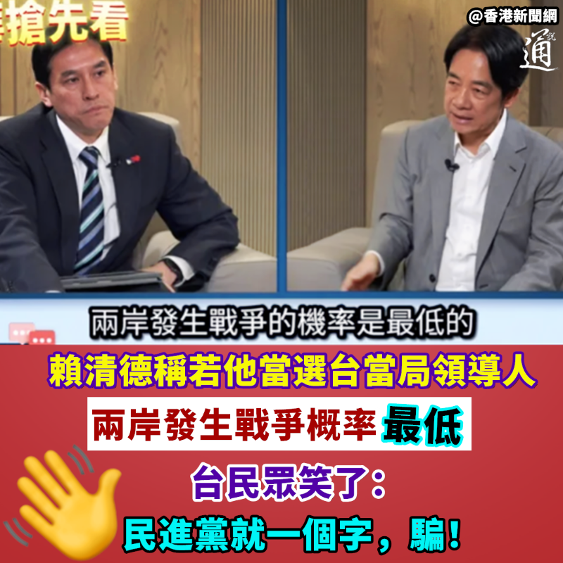 香港新聞網11月6日電 賴清德若當選台當局領導人,兩岸發生戰爭概率最低?台灣民眾都笑了! 距離2024年台灣“大選”(2024年1月13日)不足百天,民進黨“大選”參選人賴清德跑選舉行程不斷。近期,他坐客網絡節目《下班瀚你聊》,主持人黃暐瀚提到,中國國民黨一直論述,若賴清德當選台當局領導人,兩岸會打仗,詢問賴會否擔心因此影響選情? 讓人跌破眼鏡的是,賴清德竟然在節目中宣稱,若他當選,兩岸發生戰爭的概率是最低的,因為他最有能力守護所謂“台灣安全”。