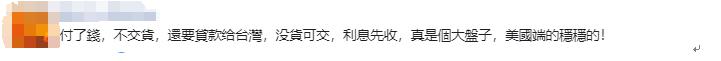 “付了錢,不交貨,還要貸款給台灣,沒貨可交,利息先收,真是個大盤子,美國端得穩穩的。”