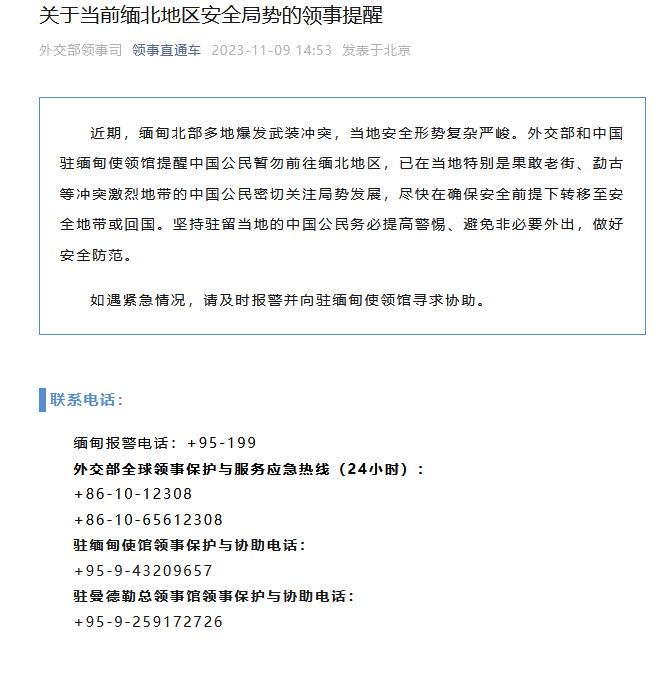 香港新聞網11月9日電 據微信公眾號“領事直通車”9日消息,近期,緬甸北部多地爆發武裝衝突,當地安全形勢複雜嚴峻。外交部和中國駐緬甸使領館提醒中國公民暫勿前往緬北地區,已在當地特別是果敢老街、猛古等衝突激烈地帶的中國公民密切關注局勢發展,盡快在確保安全前提下轉移至安全地帶或回國。堅持駐留當地的中國公民務必提高警惕、避免非必要外出,做好安全防範。